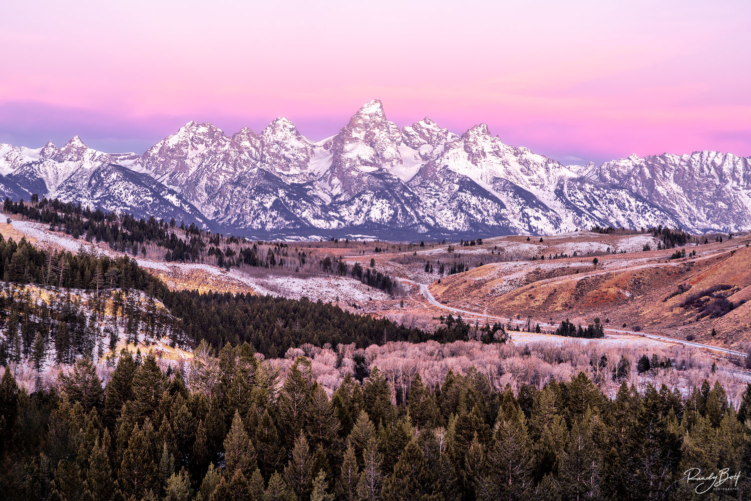 As the first light of dawn paints the snowy landscape in hues of pink and orange, the Snake River Overlook in Grand Teton National Park transforms into a breathtaking winter wonderland. The Tetons stand majestically in the background, their peaks dusted with pristine snow, while the frozen Snake River winds its way through the valley below. The crisp, cold air carries a serene stillness, broken only by the occasional rustle of wildlife awakening to the new day. The soft glow of the rising sun casts long shadows across the icy expanse, creating a mesmerizing scene that captures the raw beauty of nature in winter. Limited Edition from the Grand Teton gallery