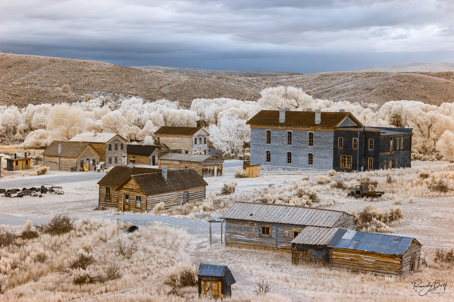 The old ghost town of Bannack in Montana makes an amazing infrared scene. Founded in 1862 during the gold rush, Bannack was the first territorial capitol of Montana. This ghost town is well worth the stop if you are in the area. Shortly after this photo was taken, the skies opened up and poured down rain. I used the Hoya R72 infrared filter for this image. We lucked out as the day we got to Bannack, it was living history days so volunteers were working the shops, mining for gold, and the doctor was in. Limited edition print from the Infrared gallery. Photo © copyright by Randy Bott.