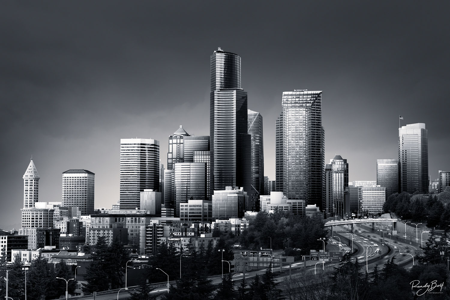 The iconic view of Seattle from the Jose Rizal Bridge. I wanted a different look so I thought about how I could make Seattle look like Gotham. Most photographers photograph this location at sunset. In the summer, the sun sets behind the city. Built in 1911, it was one of the first permanent steel bridges in Seattle. Limited edition prints from the Black and White and Cityscapes gallery. Photo © copyright by Randy Bott.