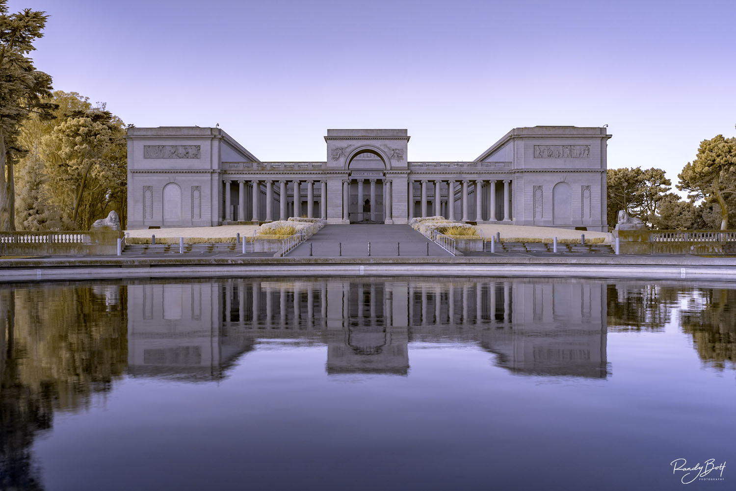 The Men in Black Headquarters, captured through the lens of an infrared camera, the iconic museum undergoes a mesmerizing transformation. Bathed in ethereal hues, the classical architecture takes on an otherworldly quality, as warm and cool tones interplay to create a surreal visual experience. The verdant surrounding landscape, typically vibrant, now appears in muted tones, allowing the architectural details to take center stage. The statues and sculptures that adorn the exterior of the Legion of Honor emerge with a timeless grace, their forms highlighted by the unique tonal range of the infrared spectrum. Limited edition print from the Surreal Infrared gallery. Photo © copyright by Randy Bott.