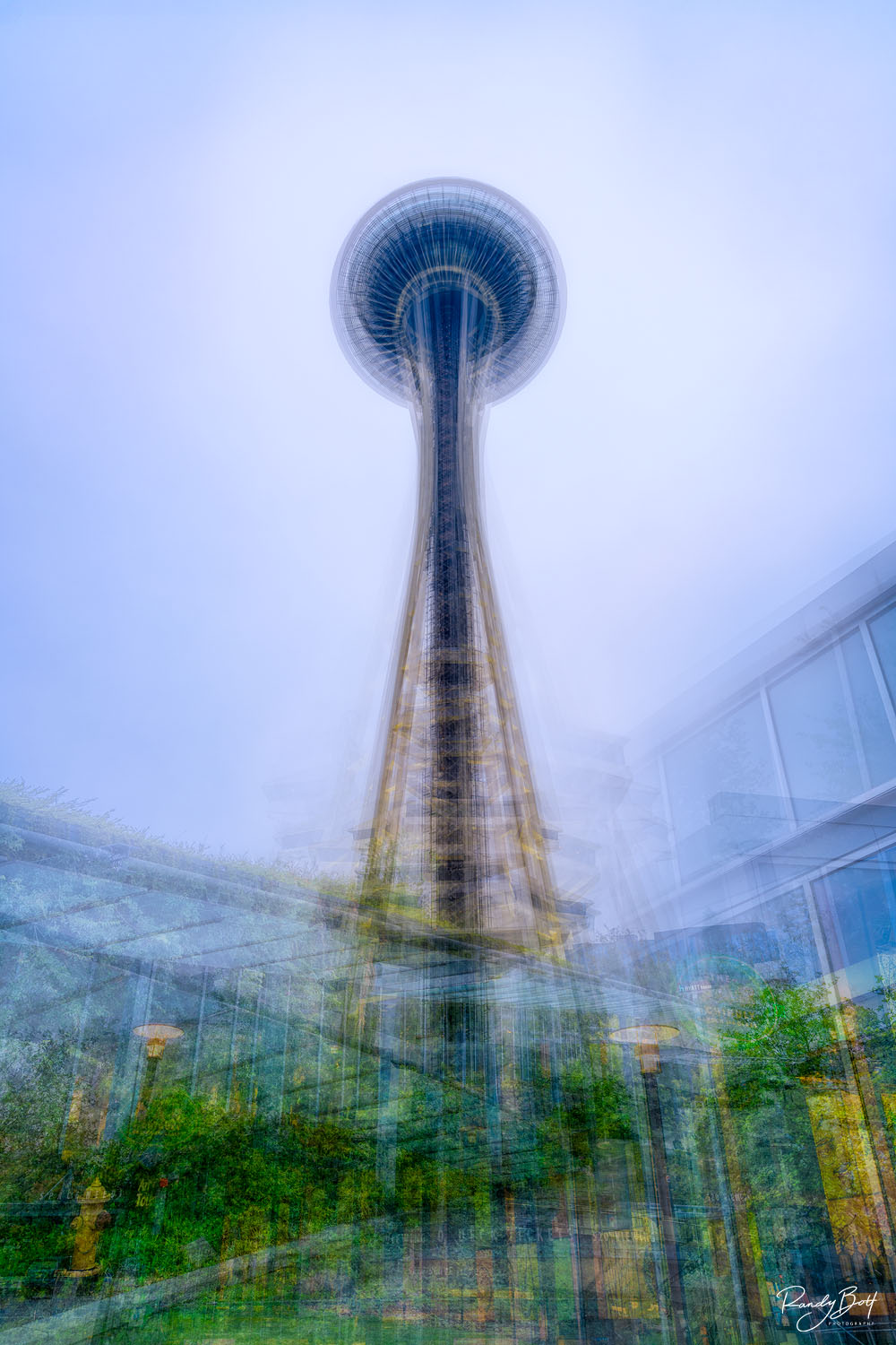 The Space Needle in an abstract composition that captures the iconic structure from multiple perspectives. The process involves taking numerous photographs of the Space Needle from different angles and distances. These images are then layered and blended together to form a composite that blurs the lines between photography and painting. In this artistic interpretation, the Space Needle might appear both familiar and surreal, with its recognizable shape fragmented and reassembled in a dreamlike manner. Limited edition print from the Abstract gallery. Photo © copyright by Randy Bott.