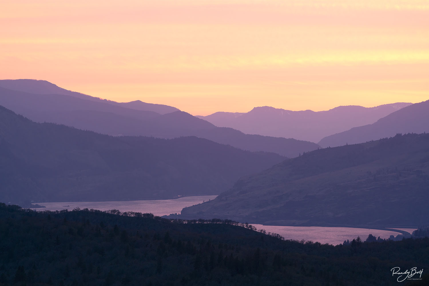 An amazing sky over the Columbia Gorge. The Columbia River reflecting the light from the sky and revealing a Z pattern is what caught my attention to this scene. Driving From Goldendale to Dallesport we came across this scene and I had to stop for sunset. Both offer a beautiful and vibrant fine art image. Limited edition print from the Landscape gallery. Photo © copyright by Randy Bott.