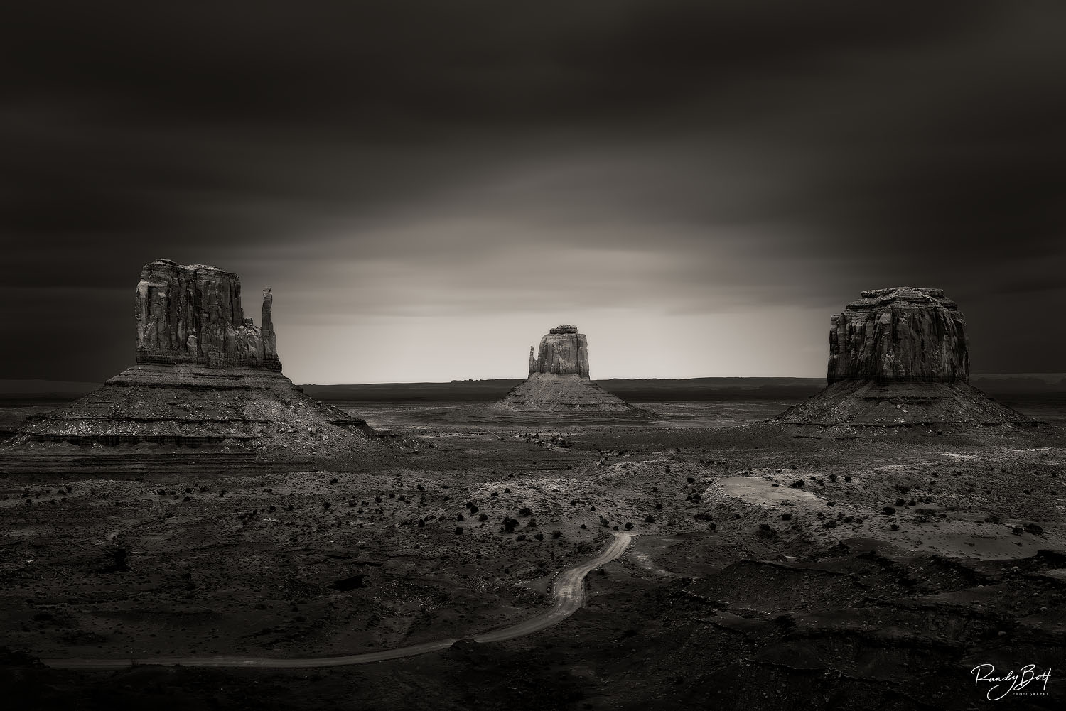 Perfect clouds at Monument Valley for a long exposure black and white image. Most people remember Monument Valley from Forest Gump when he was on his long run. Monument Valley was carved by the wind and rain over the last 50 million years to reveal the different buttes throughout the Navaho National Tribal parks. The park offers a 17 mile loop road so you can see more of the park but you need a high clearance vehicle. Limited edition prints from the Black and White gallery. Photo © copyright by Randy Bott.