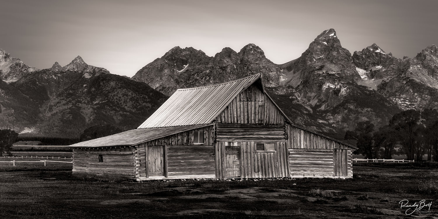 Considered by many to be the most photographed barn in the world, Thomas Alma Moulton began construction on this barn in 1913. The barns are located in the Mormon Row Historic District of the national park. In the early 1900s, several mormon families settled the area. In the early 1950s, Grand Teton National Park offered to buy the property but Alma held out until 1963. Alma Kept 1 acre of land for his family which was sold to the park in 2018. Limited edition prints from the Black and White and Panorama galleries. Photo © copyright by Randy Bott.