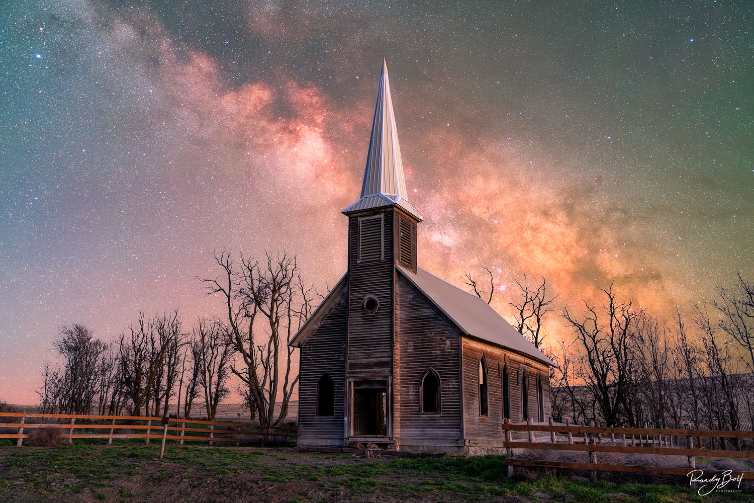 The rustic charm of the church building, with its weathered wooden exterior and simple architecture, harmonizes seamlessly with the grandeur of the celestial display overhead. The Milky Way casts its ethereal glow, illuminating the surroundings with a soft, otherworldly light, as if bestowing its blessing upon the faithful gathered below. Limited edition from the Night Sky gallery. Photo © copyright by Randy Bott.
