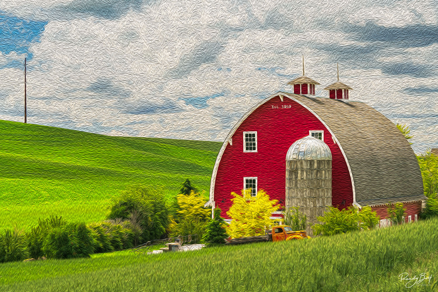 One of the best places in Washington State for landscape photography is the Palouse. Mostly because you can shoot all day long. The green hills, the blue sky, red barns and anything else you can find make for great images any time of day. The orange truck in this image is moved every year so the compositions change. One of the few places I go back to each year. Limited edition print in the Oil Painted Nature Photography gallery. Photo © copyright by Randy Bott.