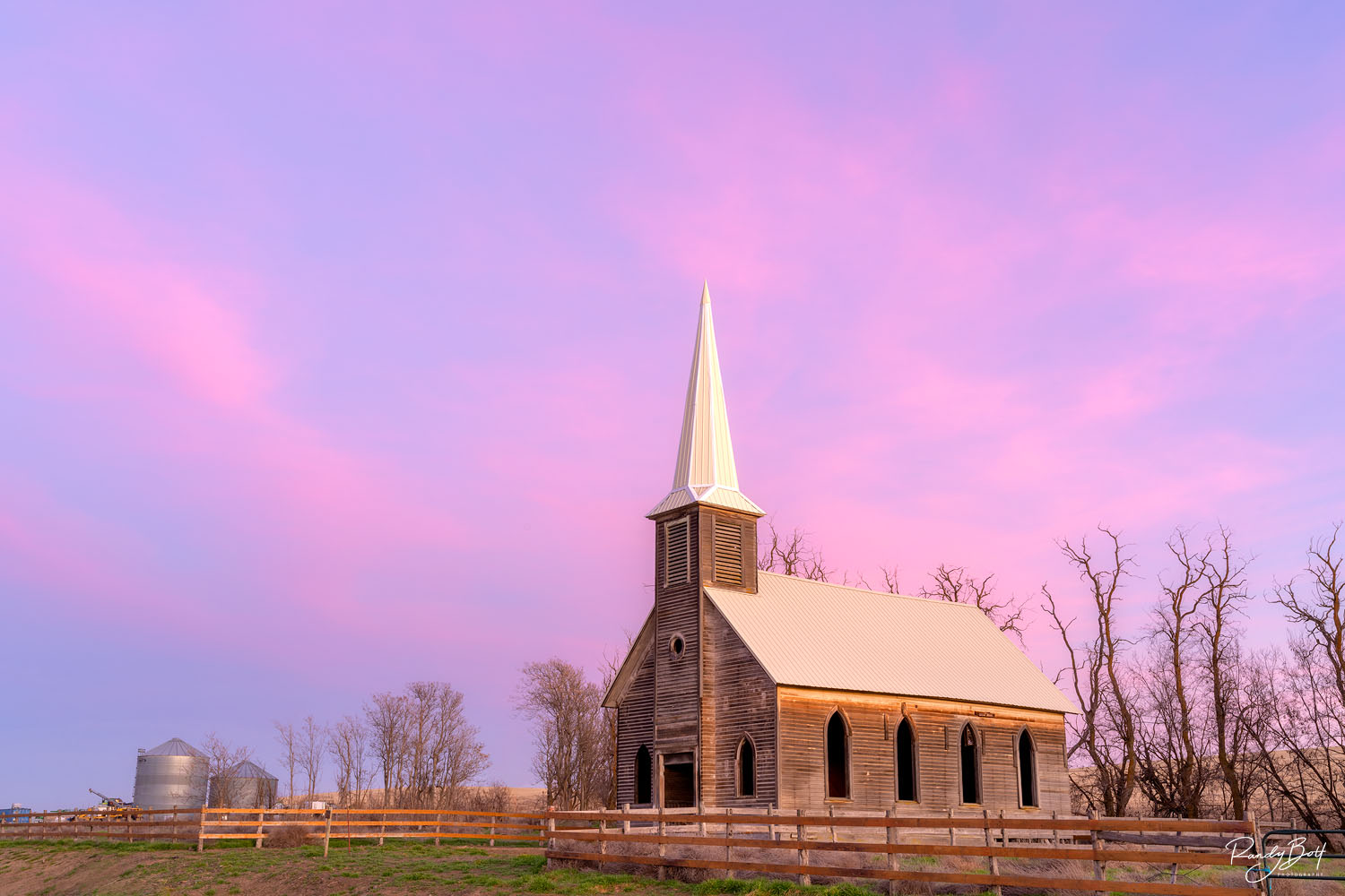 Perched upon a gentle rise in the Oregon countryside, the Locust Grove Church stands as a beacon of serenity amidst the rolling hills. As the golden hour descends upon the landscape, transforming the sky into a canvas of pastel hues, the church becomes enveloped in a magical glow. Limited edition from the Landscape gallery. Photo © copyright by Randy Bott.