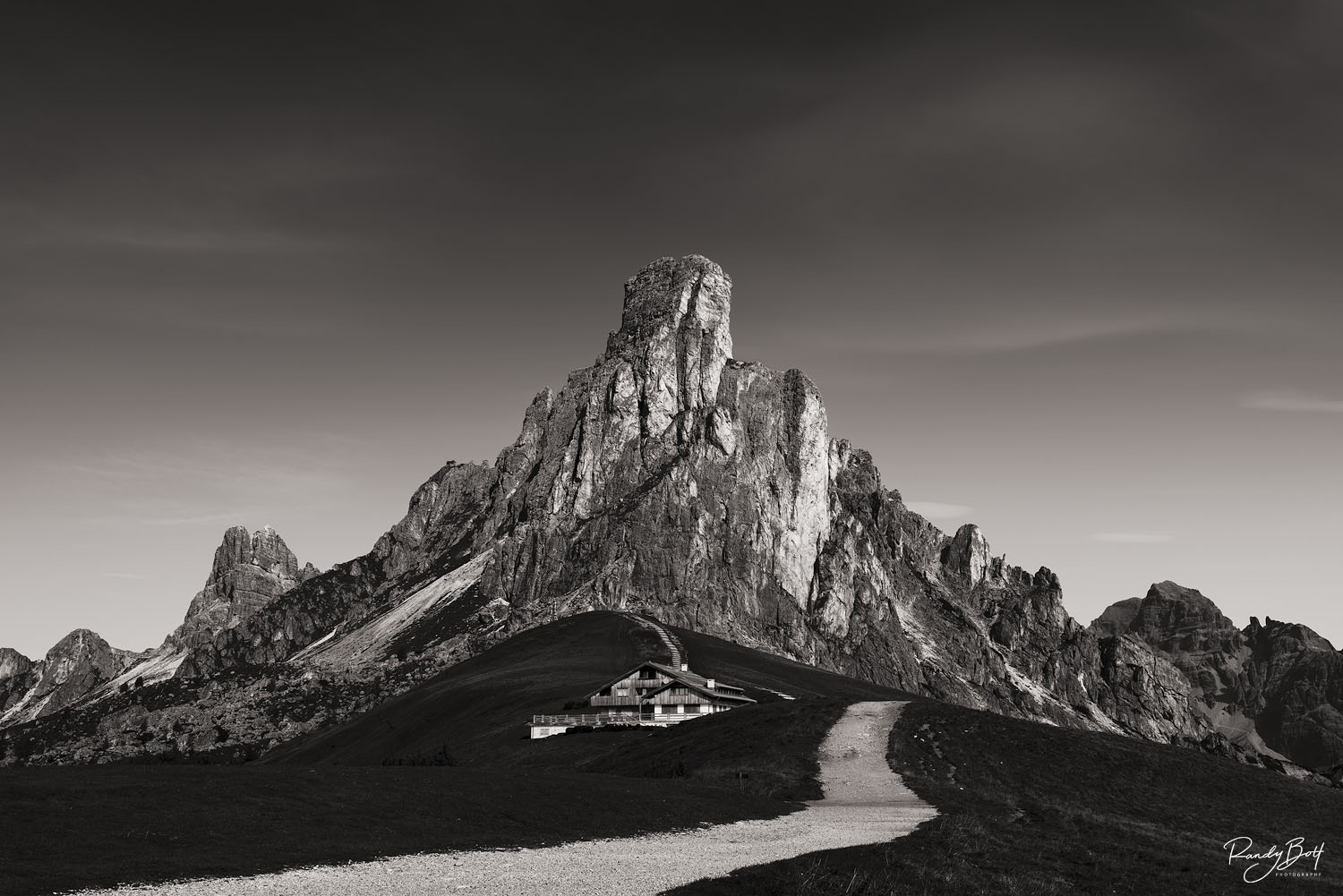 Surrounded by pristine alpine scenery, Ra Gusela showcases the natural beauty and geological wonders of the Dolomites. Visitors to this region can witness the captivating interplay of light and shadow on the rugged cliffs, especially during sunrise and sunset, creating a magical atmosphere that adds to the allure of this natural marvel. Limited edition print from the European Fine Art and Black and White galleries. Photo © copyright by Randy Bott.