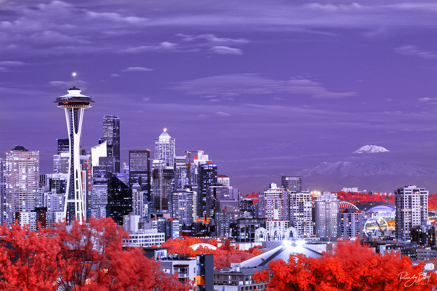 Infrared photograph of Seattle and the Space Needle from Kerry Park. Mount Rainier in the background always puts on a show in the Pacific Northwest. This infrared photograph was taken with a 665 nm infrared converted camera from Life Pixel Infrared in Mukilteo Washington. The exciting part of infrared photography is that the colors are outside the visual spectrum so have fun with the editing process. Limited edition print from the Infrared gallery. Photo © copyright by Randy Bott.