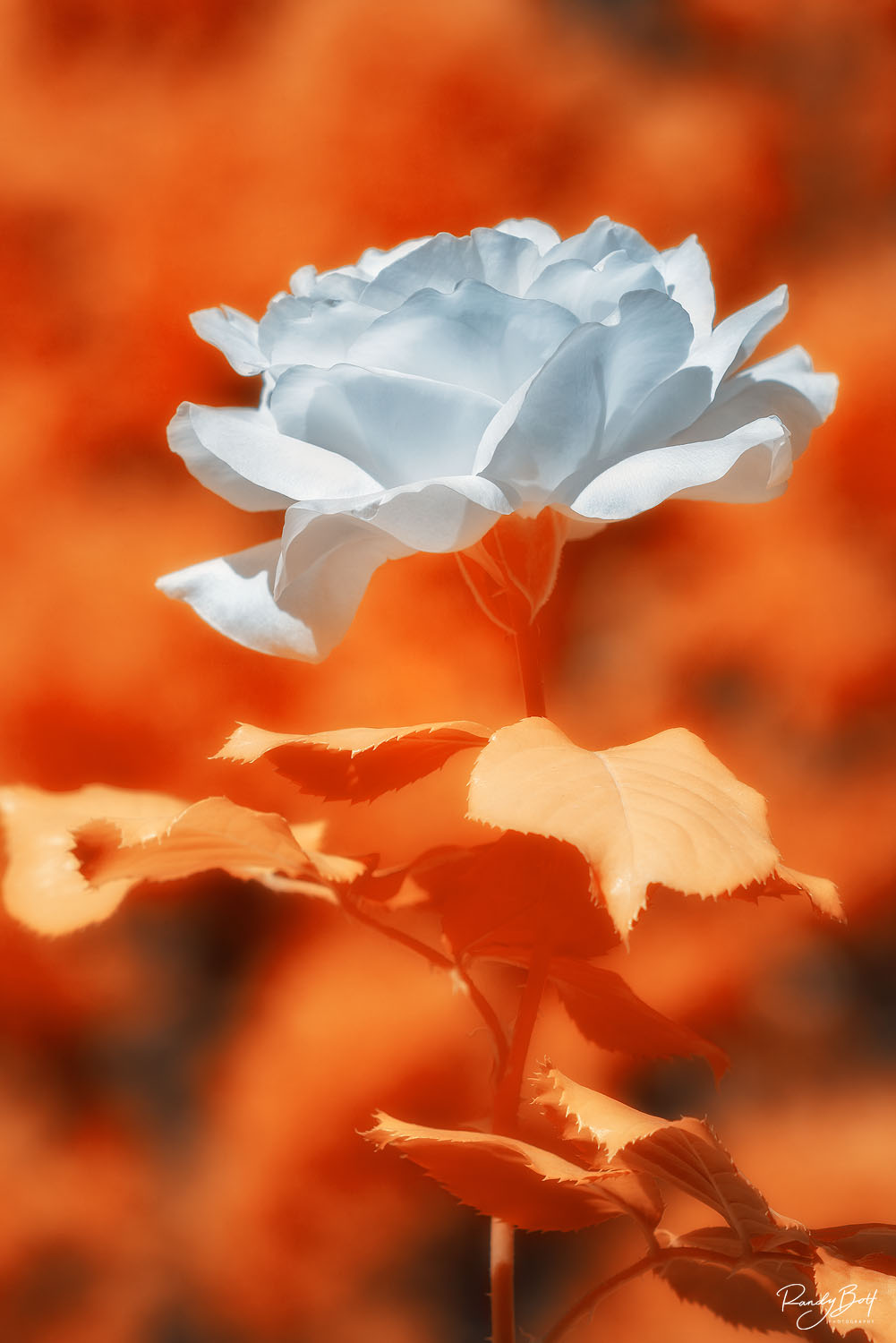 It's amazing what you can find in your own neighborhood while walking around with a full spectrum infrared camera. Blooming roses make for great infrared subjects in super color 590 nm infrared. Infrared photography gives a whole new look to a normal scene. Limited edition print from the Infrared gallery. Photo © copyright by Randy Bott.