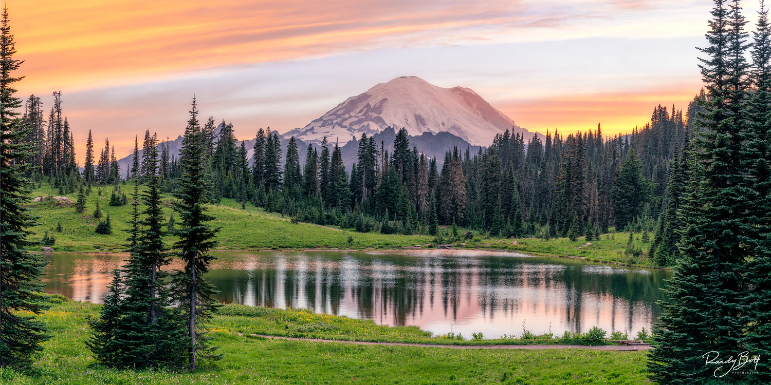 Tipsoo Lake, nestled high in the Cascade Mountains of Washington State, transforms into a scene of breathtaking beauty at sunset. The serene, mirror-like waters of the lake reflect the vibrant hues of the evening sky—rich oranges, deep purples, and soft pinks blending together in a mesmerizing display. The surrounding alpine meadows, dotted with wildflowers, catch the fading light, their colors deepening as the sun dips below the horizon. In the distance, the majestic peak of Mount Rainier looms, its snow-capped summit glowing with a soft, golden light. The tranquil atmosphere, with the gentle rustle of the breeze and the distant calls of birds, creates a perfect moment of peace and natural splendor. Limited Edition print from Mountains and Panorama galleries. Photo © copyright by Randy Bott.