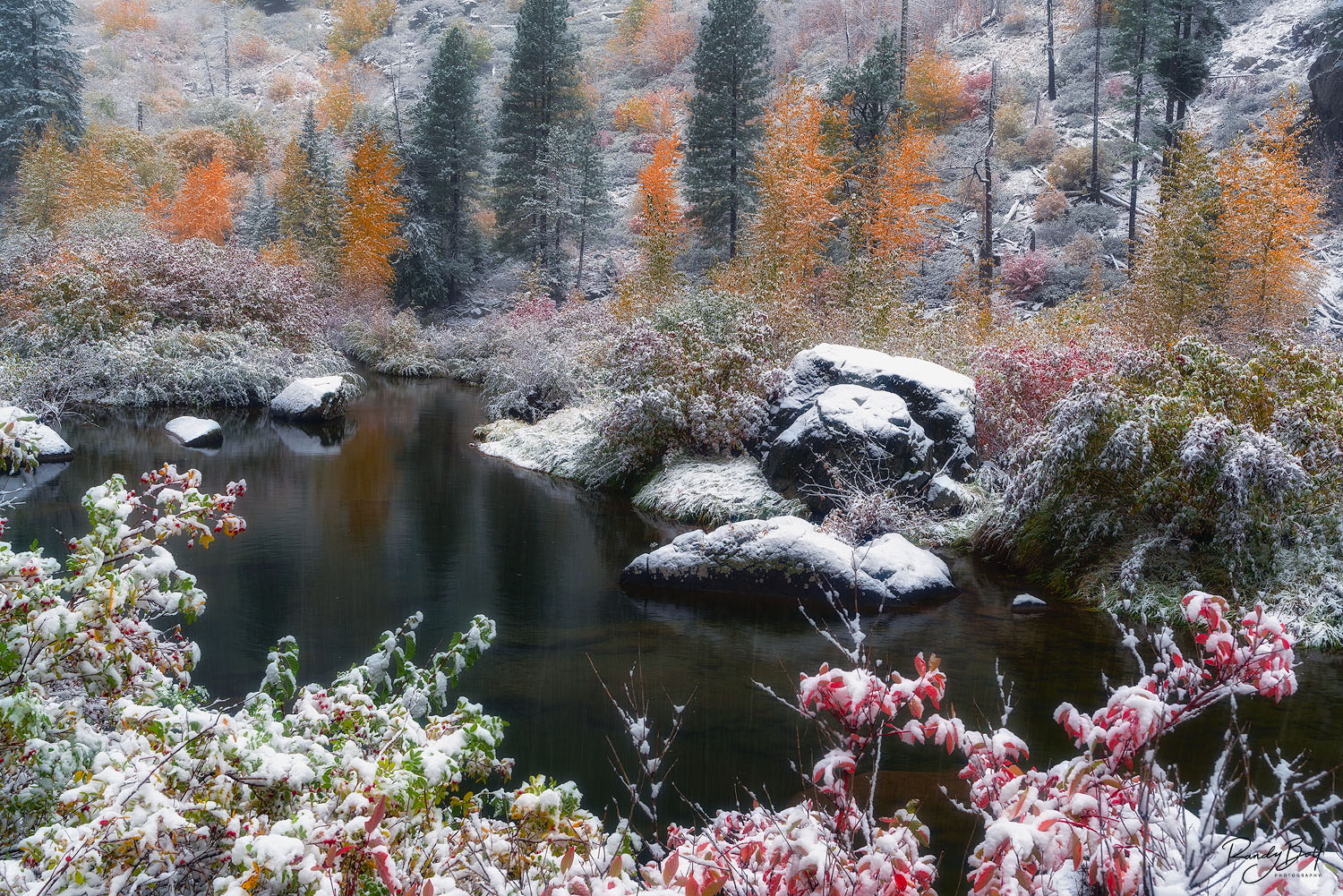 Embark on a sensory journey through the enchanting embrace of Tumwater Canyon, where nature orchestrates a captivating ballet of fall colors and snow, reflected in the pristine waters of the Wenatchee River. This picturesque destination in Washington state unveils a harmonious convergence of seasons, creating a visual symphony that captures the hearts of all who venture into its embrace. Limited edition print from the Landscape gallery. Photo © copyright by Randy Bott.