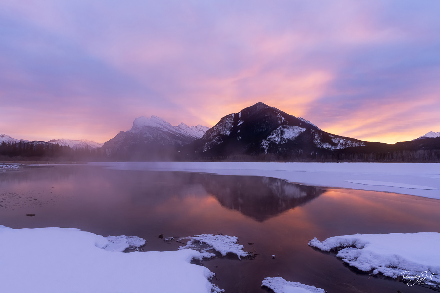 Mount Rundle reflecting in the Vermilion Lakes in Banff, Canada. The glow of the sunrise with the mountains causing light beams made for a stunning view this morning. It was well below freezing this morning but warmth of the hot spring flowing into the lakes kept the air temperature warmer. Limited edition print from the Mountains gallery. Photo © copyright by Randy Bott.
