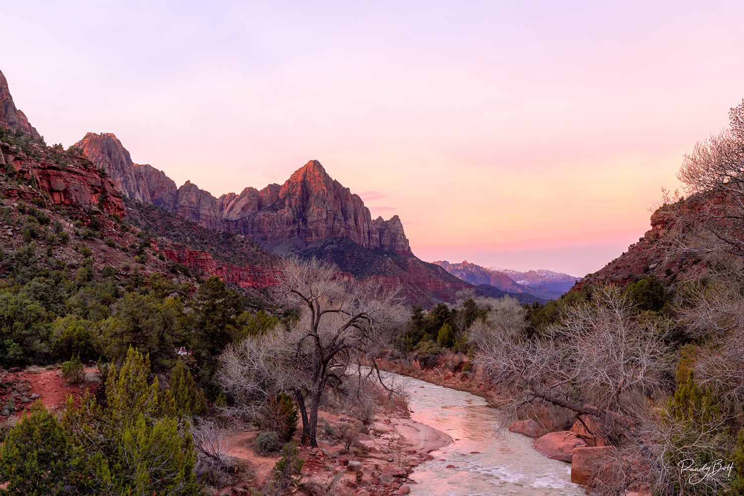 Looking towards the Watchman from the bridge in Zion National Park. The rising sun lit up clouds just before sunrise on this spring morning. The Virgin River below winding its way through the park giving life to the surrounding area. The hard part was not getting hit by a car while standing on the bridge. Limited edition print from the Landscape gallery.
